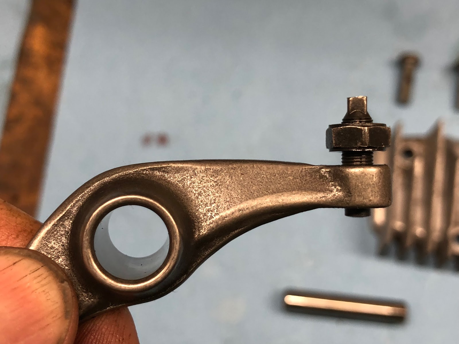 At this point there should be significant play between the adjustment stud at the end of the rocker arm and the top of the valve stem. We will adjust this gap at a later step of the assembly process.
